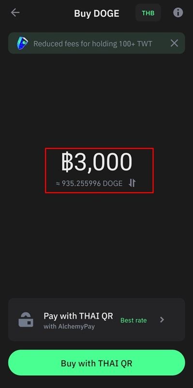 - ค้นหาและเลือก DOGE จากนั้น กรอกจำนวนเงินที่คุณต้องการใช้ซื้อ DOGE