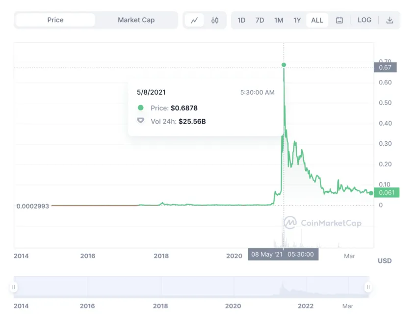 หากคุณดูประวัติราคาของ Dogecoin คุณจะเห็นว่าราคาต่ำสุดตลอดกาลอยู่ที่ 0.00008574 ดอลลาร์ ซึ่งเกิดขึ้นหลังจากที่มันเปิดตัวเป็นเวลา 2 ปี อย่างไรก็ตาม ตลาดกระทิงในปี 2021 ได้ผลักดันราคาของมันให้ขึ้นไปแตะระดับสูงสุดตลอดกาลที่ 73 เซนต์ ในวันที่ 27 กันยายน 2023 ราคาของ DOGE ซื้อขายที่ระดับเกือบๆ 6 เซนต์ ซึ่งลดลงกว่า 92% จากราคาสูงสุดตลอดกาลของมัน เมื่อการคาดการณ์ราคา Dogecoin (DOGE) ได้ดำเนินต่อไป ราคาของเหรียญได้ก้าวข้ามการคาดการณ์ในปี 2021 ที่ 0.0087 ดอลลาร์ไปเป็นที่เรียบร้อยแล้ว จากประวัติราคาเหล่านี้ — โดยเฉพาะอย่างยิ่งระดับสูงสุดตลอดกาลในปี 2021 — มันก็อาจจะมากเกินพอที่จะชักชวนให้นักลงทุนมาซื้อเหรียญคริปโตตัวนี้ได้