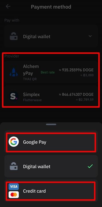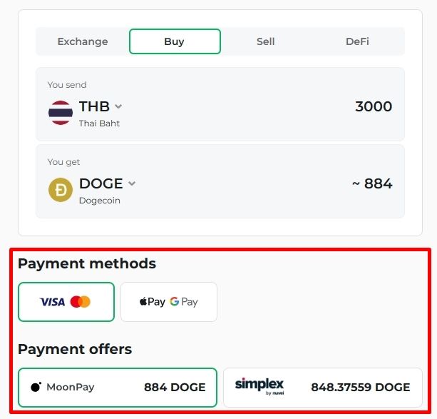 - เลือกผู้ให้บริการชำระเงินและอัตราที่ดีที่สุดที่คุณต้องการ จากนั้น ทำตามขั้นตอนของผู้ให้บริการชำระเงินเพื่อยืนยันการซื้อเหรียญ DOGE ของคุณ