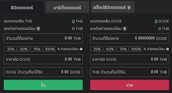 - เมื่อทำการเลือกประเภทคำสั่งซื้อเรียบร้อยแล้ว ระบบก็คำนวนจำนวนเหรียญ Dogecoin ที่คุณจะได้รับจากมูลค่าของเงินที่คุณกรอกลงไปเพื่อทำการซื้อ โดยเหรียญคริปโตที่ได้รับมานั้นจะเป็นการหักค่าธรรมเนียมจากการเทรดออกเรียบร้อยแล้ว