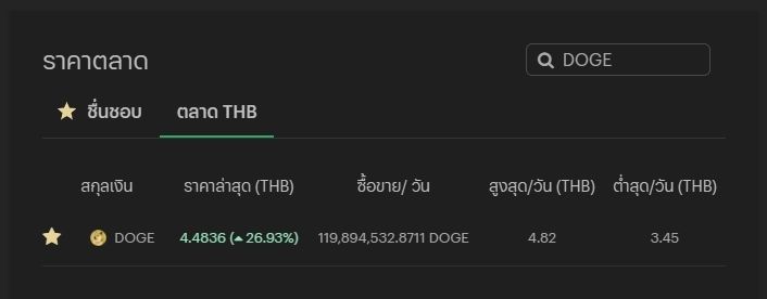 - ไปที่ส่วนของ ราคาตลาด แล้วค้นหา DOGE จากนั้น คลิกเพื่อเข้าสู่คู่เทรด DOGE/THB
