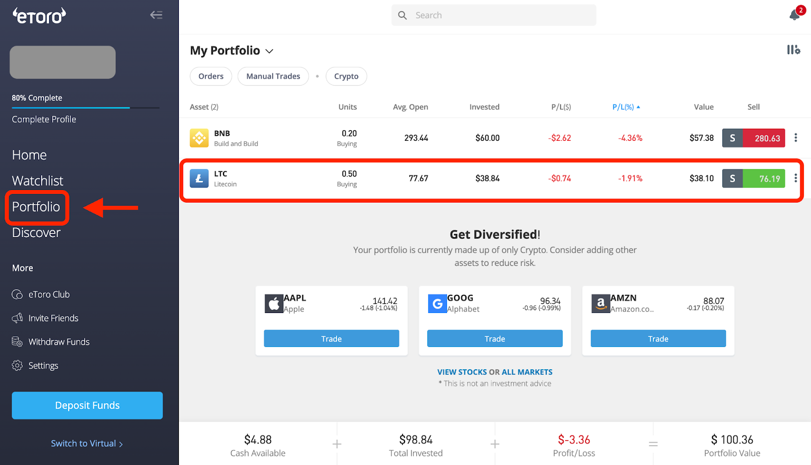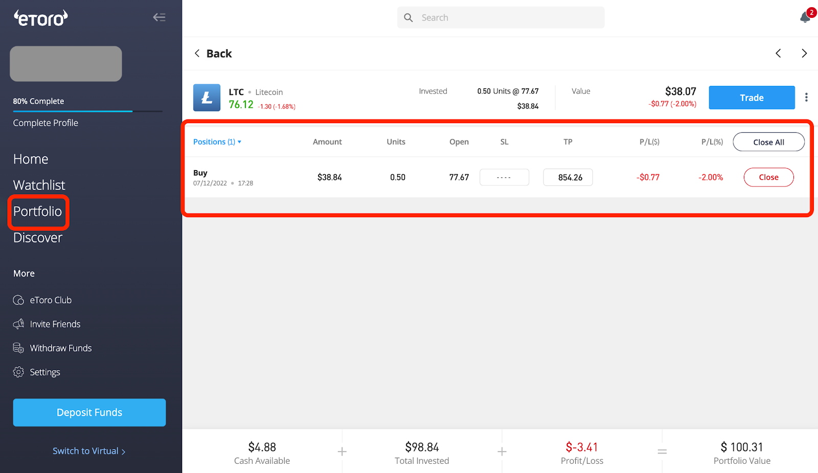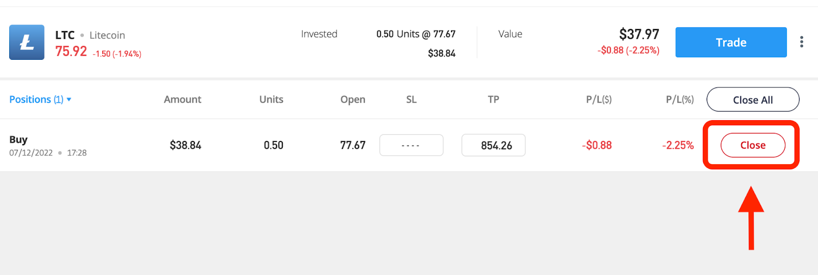 หากคุณมีสถานะที่เปิดไว้หลายสถานะ และต้องการดูตัวเลือกเพิ่มเติมสำหรับการเทรด Litecoin คลิกไปที่ชื่อสินทรัพย์ดังกล่าว คุณก็จะเห็นหน้าต่างการซื้อขายของสินทรัพย์นั้นๆ ปรากฏขึ้นมา