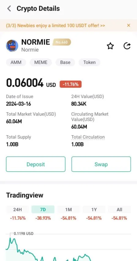 ณ วันที่ 18 เมษายน 2024 ราคาของ NORMIE สูงขึ้น 2,968.04% จากราคาต่ำสุดตลอดกาล โทเค็นมีมนี้มีปริมาณสูงสุดที่หนึ่งล้าน NORMIE และมีมูลค่าตลาด 71.3 ล้านดอลลาร์