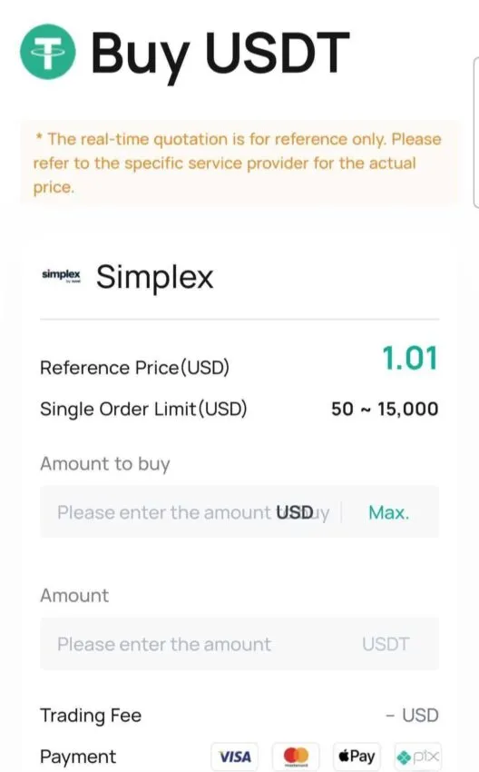 3. เลือกเหรียญที่คุณต้องการใช้เติมเงินลงในบัญชี ที่นี่เราได้เลือก USDT ป้อนจำนวนที่คุณต้องการซื้อและเลือกจากวิธีการชำระเงินหลายวิธี รวมถึงบัตรเดบิต/เครดิต และ Apple Pay