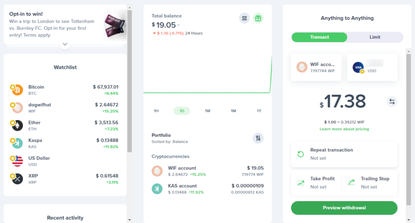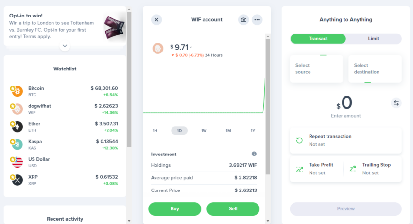 1. เลือก WIF ในพอร์ตการลงทุนของคุณ: ไปที่บัญชี Uphold ของคุณแล้วดูที่ส่วนตรงกลาง เลื่อนลงมาเพื่อค้นหา WIF จากนั้น คลิกไปที่ WIF เพื่อดูยอดคงเหลือและประวัติการทำธุรกรรมของคุณ