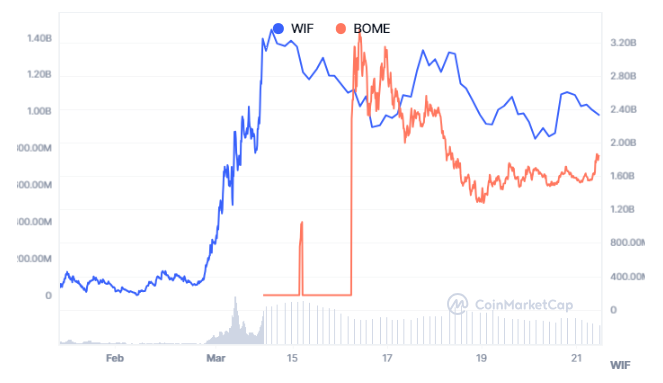 ทั้ง WIF และ BOME ต่างก็มีผลงานที่น่าประทับใจในช่วงเดือนมีนาคม 2024 มูลค่าตลาดของทั้งคู่ได้ขึ้นไปแตะระดับสูงสุดตลอดกาลภายในเวลาที่ห่างกันไม่กี่วัน BOME มีมูลค่าตลาดสูงสุดที่ 1.5 พันล้านดอลลาร์ในวันที่ 16 มีนาคม 2024 และมูลค่าตลาดของ WIF ก็ได้ขึ้นไปแตะ 3.4 พันล้านดอลลาร์ในช่วง 2 วันก่อนหน้านั้น