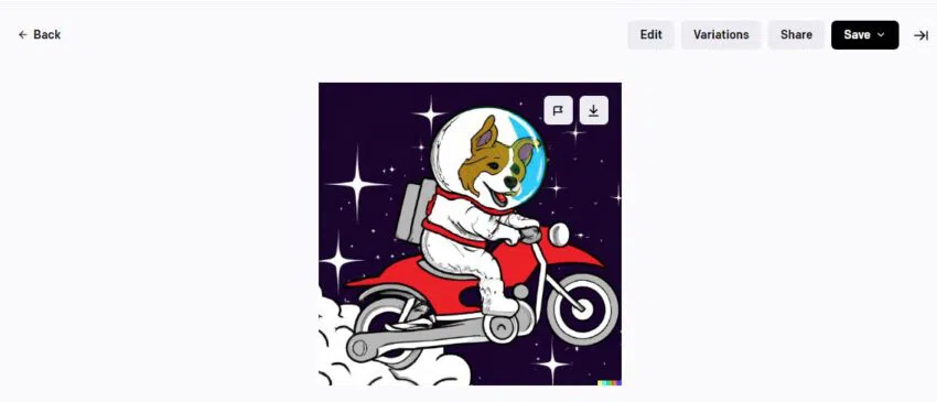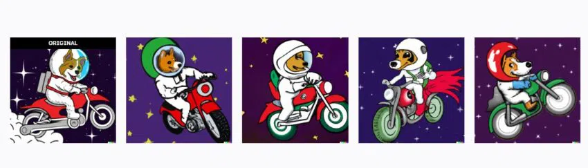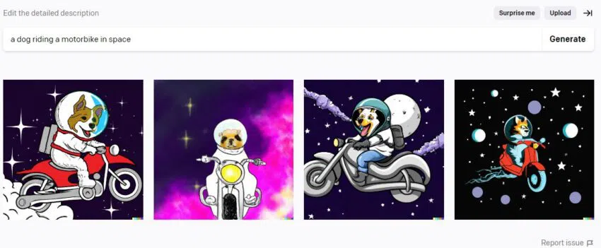 โปรแกรมจะสร้างรูปภาพ 4 ภาพต่อคำขอ 1 ครั้ง ตัวอย่างเช่น ในตัวอย่างด้านบน (สุนัขขี่มอเตอร์ไซค์ในอวกาศ) เราได้สร้างรูปภาพ 4 ภาพต่อไปนี้ โดยแต่ละภาพนั้นมีสไตล์ที่แตกต่างกัน