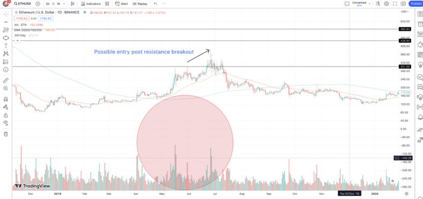 - ระบุแนวต้านที่แข็งแกร่งที่สุด และวาดเส้นแนวต้านดังกล่าวเหนือบริเวณที่เส้น MA ตัดกัน