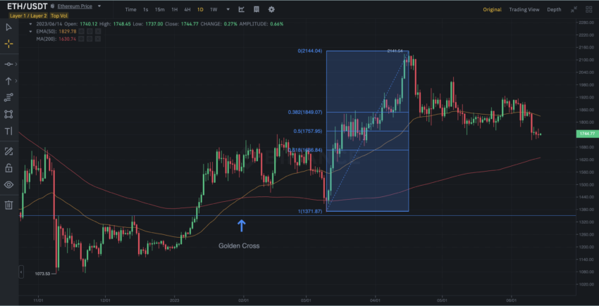 หากคุณสับสนกับการวางระดับ Retracement Levels อย่างถูกต้อง ให้ลากจากจุดที่ราคาแกว่งตัวต่ำไปจุดที่ราคาแกว่งตัวสูง หลังการเกิด Golden Cross