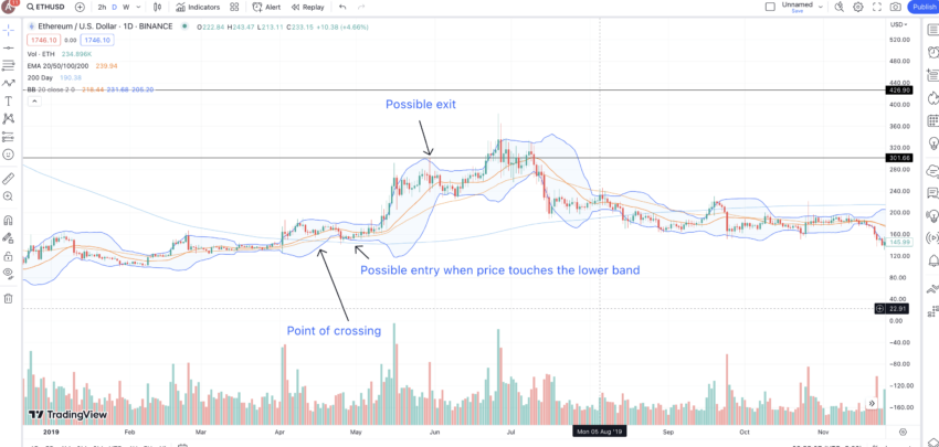 - จุดออกที่ดีที่สุดคือเมื่อราคาขึ้นไปแตะแถบด้านบนของ Bollinger Bands