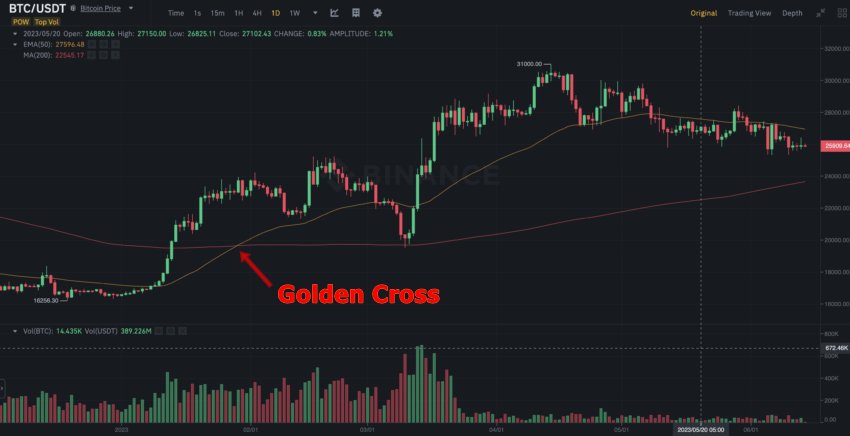 เหมือนที่ได้เอ่ยไปตอนต้น Golden Cross คือ “สัญญาณขาขึ้น” ที่เส้น MA ในระยะสั้นวิ่งตัดขึ้นไปเหนือเส้น MA ในระยะยาว และส่งสัญญาณโมเมนตัมในเชิงบวกที่สอดคล้องกับแนวโน้มราคา