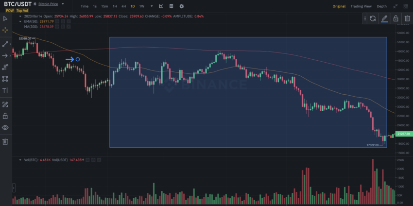 อีกสิ่งที่ควรรู้ก็คือ ขั้วตรงข้ามของ Golden Cross ซึ่งจะถูกเรียกว่า Death Cross ซึ่งเป็นการที่เส้น MA ในระยะสั้นวิ่งตัดลงไปอยู่ใต้เส้น MA ในระยะยาว ซึ่งเป็นสัญญาณที่บ่งบอกถึงการลดลงของราคา