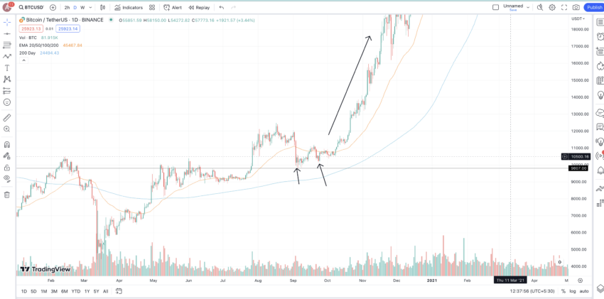 - เมื่อระบุจุดที่เกิด Golden Cross ได้แล้ว ให้จับตาดูราคาและความสัมพันธ์กับเส้น EMA 50 วัน อย่าขายหากอินดิเคเตอร์ตัวอื่นๆ ระบุสัญญาณขาลง แต่ให้ดูว่าราคาตกลงไปที่ EMA 50 วันแล้วเด้งกลับขึ้นไปหรือไม่ นั่นหมายความว่ามันอาจจะเป็นเวลาที่ดีที่จะทำการซื้อเพิ่ม