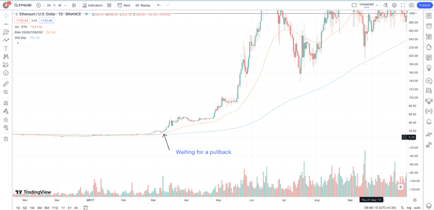 ในกรณีนี้ เส้น EMA 50 วันจะทำงานเหมือนระดับแนวต้านและแนวรับที่เปลี่ยนแปลงได้ อีกทั้ง มันจะดีกว่าหากใช้งานมันร่วมกับ Pullback Strategy ด้วยวิธีนี้ คุณจะได้พบกับจุดเข้าซื้อที่ดียิ่งขึ้น
