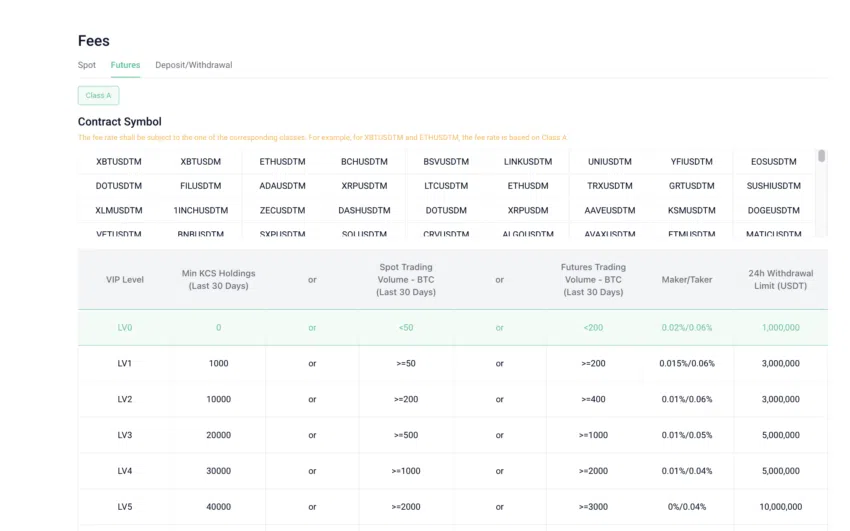 สำหรับการซื้อขายฟิวเจอร์ส ค่าธรรมเนียมสำหรับ Maker และ Taker จะถูกกำหนดไว้ที่ 0.02% และ 0.06% ตามลำดับ นอกจากนี้ KuCoin อนุญาตให้ฝากสกุลเงินดิจิทัลได้ฟรี แต่การถอนออกจะต้องเสียค่าธรรมเนียมโดยอิงจากเครือข่ายและที่อยู่ที่ใช้ในการทำธุรกรรม