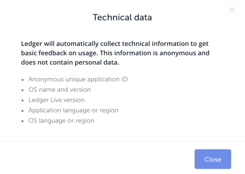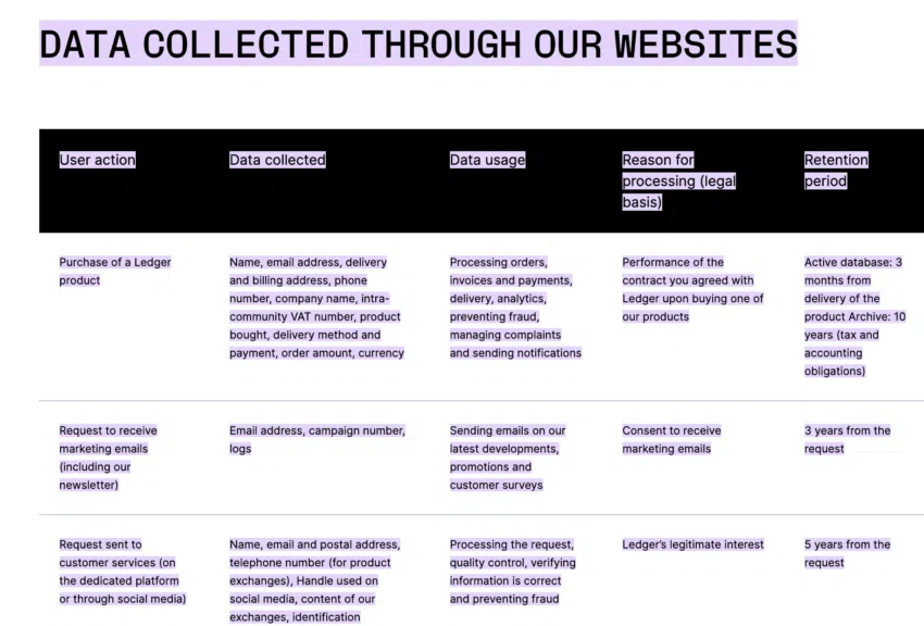 ระยะเวลาของข้อมูลที่ได้มีการบันทึกไว้ อาจยาวนานได้สูงสุดถึง 5 ปีในบางกรณี อย่างไรก็ตาม Ledger Live ยังคงรักษาจุดยืนในเรื่องการไม่เก็บข้อมูล แต่ระบุว่าข้อมูลจะถูกส่งต่อไปยังพันธมิตรแทน