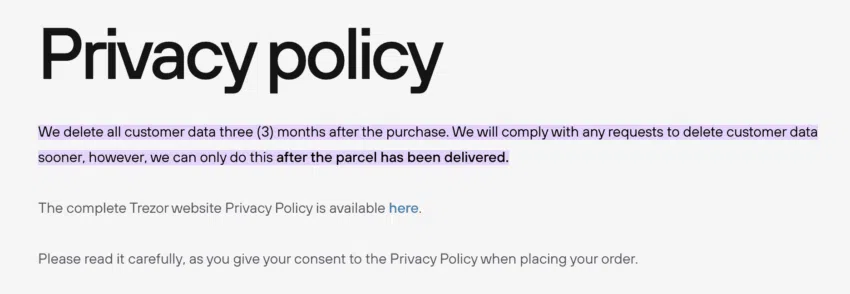 ในทางกลับกัน Trezor ใช้วิธีการรวบรวมข้อมูลที่กระชับมากกว่า นโยบายความเป็นส่วนตัวระบุไว้อย่างชัดเจนว่า บริษัทจะลบข้อมูลลูกค้าภายใน 3 เดือนหลังจากซื้อผลิตภัณฑ์ และพวกเขากำลังพิจารณาแนวทางที่รวดเร็วกว่าในการลบข้อมูล