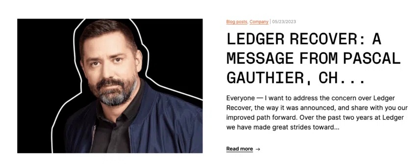 ในเดือนพฤษภาคม 2023 Ledger พ่ายแพ้ในหัวข้อนี้ไปอย่างสิ้นเชิง เนื่องจากพวกเขาต้องเผชิญกับเสียงวิพากษ์วิจารณ์มากมาย เพราะคุณสมบัติ “การกู้คืน” ใหม่ของพวกเขา แถลงการณ์บน Reddit ของ Eric Larcheveque (Murzika) ยิ่งเป็นการสร้างความอึดอัดใจให้กับเหล่าผู้ใช้งานที่มีความคิดเห็นขัดแย้งกับการอัพเดต “การกู้คืน” ที่แปลกประหลาดในครั้งนี้