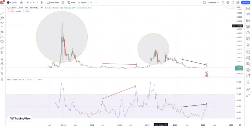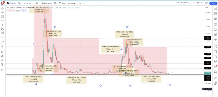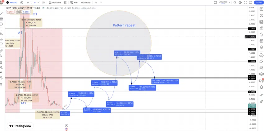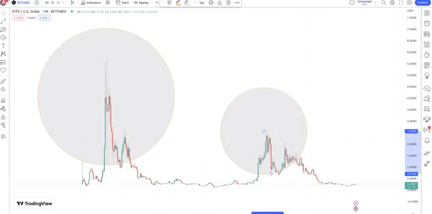 ประวัติราคาของ IOTA ค่อยเริ่มไต่สูงขึ้นจนไปถึงจุดสูงสุด จากนั้นก็ค่อยๆ ลดลงมา ก่อนที่จะเริ่มเคลื่อนไหวแบบไซด์เวย์ รูปแบบต่อมาก็เริ่มขึ้นคล้ายๆ กัน โดยเริ่มไต่ราคาขึ้นไปถึงจุดสูงสุด จากนั้นก็ค่อยๆ ลดลงมาและเคลื่อนไหวแบบไซด์เวย์อีกครั้ง