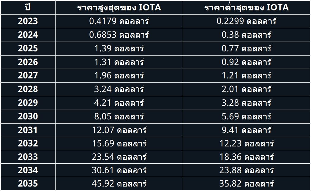 เมื่อเราใช้ระดับราคาสูงสุดและต่ำสุดของ IOTA จนถึงปี 2030 ในการคำนวนเพิ่มเติม เราสามารถประมาณการราคาของ IOTA ไปได้จนถึงปี 2035 และนี่คือตารางการคาดการณ์ราคาที่อาจจะสามารถช่วยคุณในการอ้างอิงได้