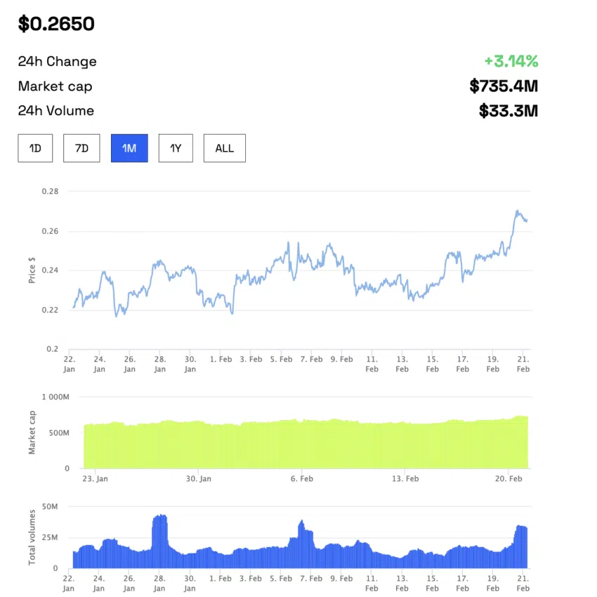 ตอนนี้ เรามาดูข้อมูลตัวชี้วัดต่างๆ ในช่วงรายเดือนของ IOTA กันดีกว่า เราสามารถเห็นการพุ่งขึ้นของราคาในช่วงวันที่ 19 กุมภาพันธ์ 2023 ได้อย่างชัดเจน ซึ่งเป็นผลมาจากมูลค่าตลาดและปริมาณการซื้อขายที่เพิ่มมากขึ้น อย่างไรก็ตาม ปัจจุบัน ปริมาณการซื้อขายของ IOTA นั้นยังอยู่ห่างจากจุดสูงสุดในช่วงวันที่ 28 มกราคม 2022
