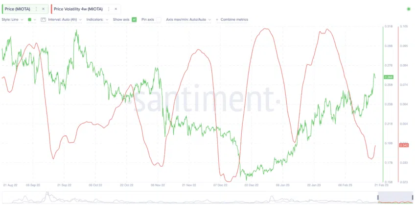 นอกจากนี้ กราฟความผันผวนยังได้แสดงให้เห็นถึงสิ่งที่น่าสนใจอีกด้วย หากสังเกตให้ดี คุณจะเห็นได้ว่าค่าความผันผวนกำลังจะเด้งกลับจากจุดต่ำสุด และหากเทียบกับประวัติของราคา คุณก็จะเห็นได้ว่าราคาจะพุ่งสูงขึ้นหลังจากความผันผวนอยู่ที่จุดต่ำสุด ดังนั้น การที่ความผันผวนกำลังปรับตัวสูงขึ้นอาจจะทำให้เราได้เห็นการชะลอตัวในระยะสั้นของราคา IOTA ก็เป็นได้