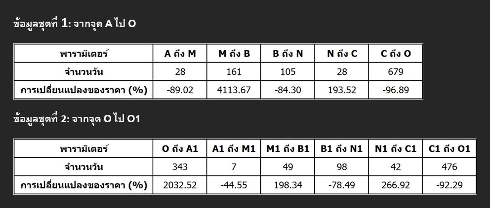 ตอนนี้ เราจะมาค้นหาการเปลี่ยนแปลงของราคาและช่วงระยะเวลาในระหว่างจุดราคาแต่ละจุดในทั้ง 2 เส้นทาง: จุด A ไปถึง O และจุด O ไปถึง O1 ซึ่งข้อมูลเหล่านี้จะช่วยให้เราสามารถคาดการณ์ถึงความเคลื่อนไหวของราคา IOTA ที่อาจจะเกิดขึ้นในระยะสั้นและระยะยาวได้