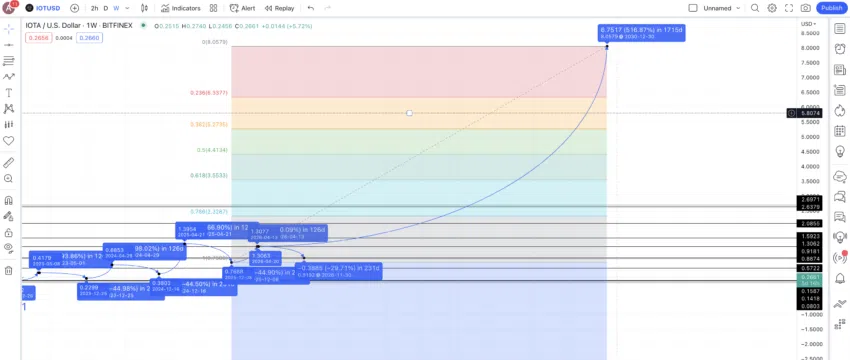 ตอนนี้ เมื่อเรามีจุดสูงสุดในปี 2026 และจุดต่ำสุดในปี 2025 แล้ว เราสามารถประมาณการความเคลื่อนไหวของราคา IOTA ไปจนถึงปี 2030 ได้โดยการใช้ Fib Level ซึ่งจะทำให้การคาดการณ์ราคาสูงสุดของ IOTA ในปี 2030 อยู่ที่ 8.05 ดอลลาร์