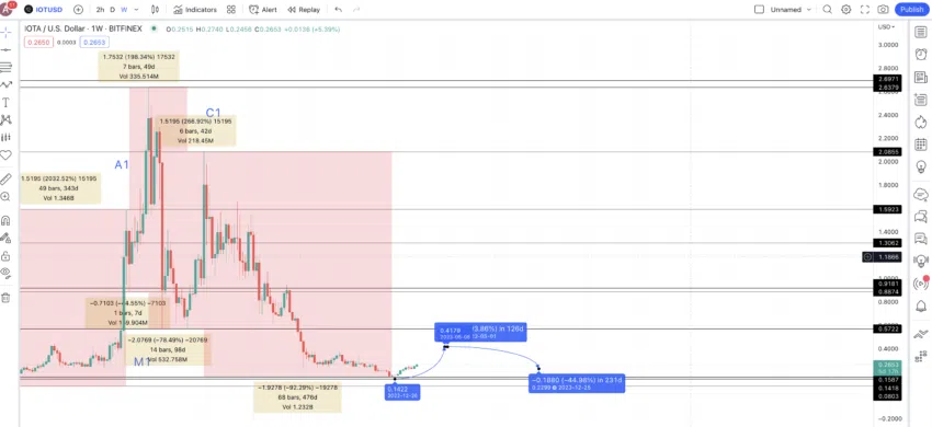 ภายในช่วงสิ้นปี 2023 จุดต่ำสุดที่คาดการณ์ไว้ของราคา IOTA อาจจะอยู่ในเส้นทางของจุดสูงที่ต่ำลง ดังนั้น จุดสูงสุดถัดไปจากจุดต่ำสุดในปี 2023 อาจจะปรากฏขึ้นในช่วง 125 วันและเพิ่มขึ้น 198.34% (การเพิ่มขึ้นต่ำสุดเป็นอันดับสองจากตารางข้อมูลด้านบน)