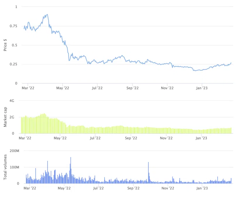 ราคาต่ำสุดในปี 2025 อาจจะอยู่ที่ 0.77 ดอลลาร์ ซึ่งจะเป็นการใช้การลดลงของราคาและกรอบระยะเวลาในช่วงก่อนหน้านี้