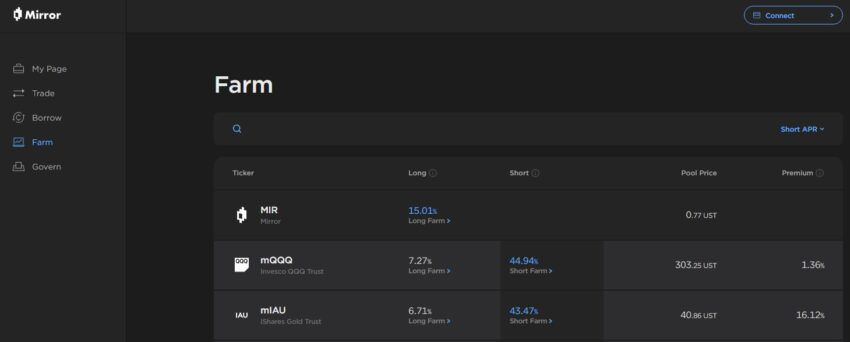 บนแถบ Farm ผู้ใช้งานจะได้รับลิสต์ของกลุ่มการล็อกที่พร้อมใช้งาน ผู้ใช้งานสามารถรับรางวัล MIR ได้ทั้งจากสถานะ Long (ซื้อ) และ Short (ขาย) ความแตกต่างระหว่างราคา Terraswap และ Oracle คือ Premium เมื่อเลือกตำแหน่ง Long Farm ผู้ใช้งานจะให้มูลค่าที่เท่ากันกับสินทรัพย์และ UST เมื่อเลือกตำแหน่ง Short Farm ผู้ใช้งานต้องล็อกหลักประกันในโปรโตคอลแล้วจึงสร้าง mAssets ขึ้นมา ผู้ใช้งานสามารถปลด LP token ได้ทุกเมื่อ