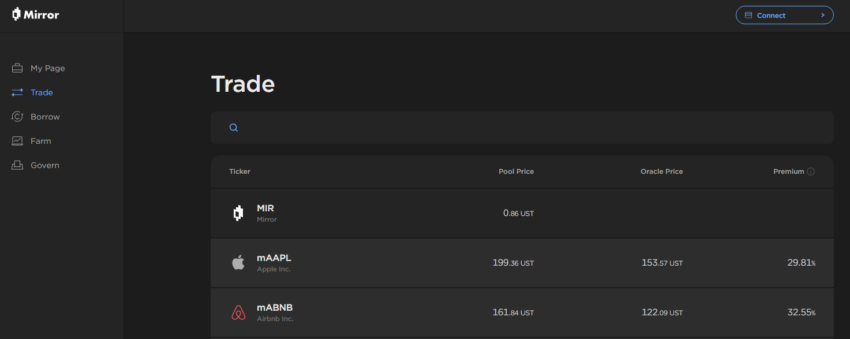 แถบนี้อนุญาตให้ผู้ใช้งานซื้อขาย MIR และหุ้นที่สร้างขึ้นใหม่ ข้อมูลเกี่ยวกับสินทรัพย์โดยประมาณของกลุ่มและราคา Oracle ก็มีแสดงให้ดูที่นี่ ตัวอย่างเช่น เมื่อซื้อ ผู้ใช้งาน mAAPL จะแสดงราคา Oracle สภาพคล่องทั้งหมด และค่าธรรมเนียมภาษี Terra blockchain นั้นช่วยอำนวยความสะดวกในการซื้อขาย