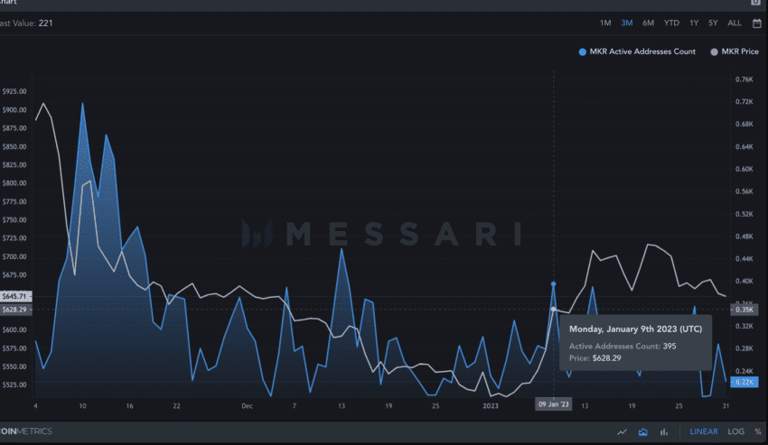 นี่คือกราฟที่แสดงให้เห็นถึงข้อมูลของจำนวน Active Address (ที่อยู่ของกระเป๋าเงินที่มีความเคลื่อนไหวในช่วงระยะเวลาที่กำหนด) ที่ถือครอง Maker จะสังเกตได้ว่าตัวเลขดังกล่าวลดลงอย่างมากตั้งแต่เดือนพฤศจิกายน 2022 อย่างไรก็ตาม จุดสูงสุดที่เกิดขึ้นในวันที่ 9 มกราคม 2023 ส่งผลให้ราคาเพิ่มสูงขึ้น (ซึ่งตลาดคริปโตขาขึ้นในวงกว้างก็มีส่วนช่วยเช่นกัน) หลังจากเดือนมกราคมเป็นต้นมา จำนวน Address และราคาของเหรียญก็เริ่มเพิ่มสูงขึ้น