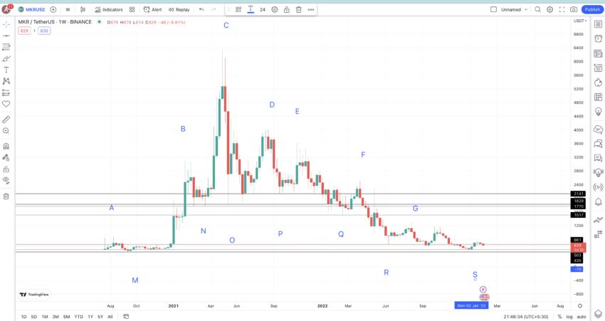 จุดถัดไปอาจจะอยู่ที่ราคา 1,536 ดอลลาร์ ซึ่งอาจจะเป็นจุดสูงสุดที่คาดการณ์ไว้สำหรับราคา MKR ในปี 2023 และเราคาดว่าค่าเฉลี่ยการลดลงที่ -57.77% และช่วงระยะเวลาสูงสุดที่ 147 วันจะเป็นตัวเลขที่เหมาะสมสำหรับจุดต่ำสุดของปี 2023 ซึ่งจะอยู่ที่ราคา 650 ดอลลาร์