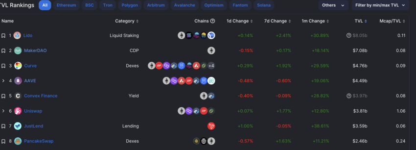 เมื่อพูดถึงการจัดอันดับโดยรวม Maker นั้นมาเป็นอันดับ 2 ในแง่ของ DeFi TVL ในฐานะโปรโตคอล CDP (Collateralized Debt Position) ในวันที่ 1 กุมภาพันธ์ 2023 Maker มี TVL รวมมูลค่ากว่า 7.08 พันล้านดอลลาร์ พื้นที่ DeFi โดยรวมนั้นมีการเติบโตมากยิ่งขึ้นในปี 2023 แม้แต่ MakerDAO เองก็เติบโตขึ้นถึง 18.14% เมื่อเทียบแบบเดือนต่อเดือน