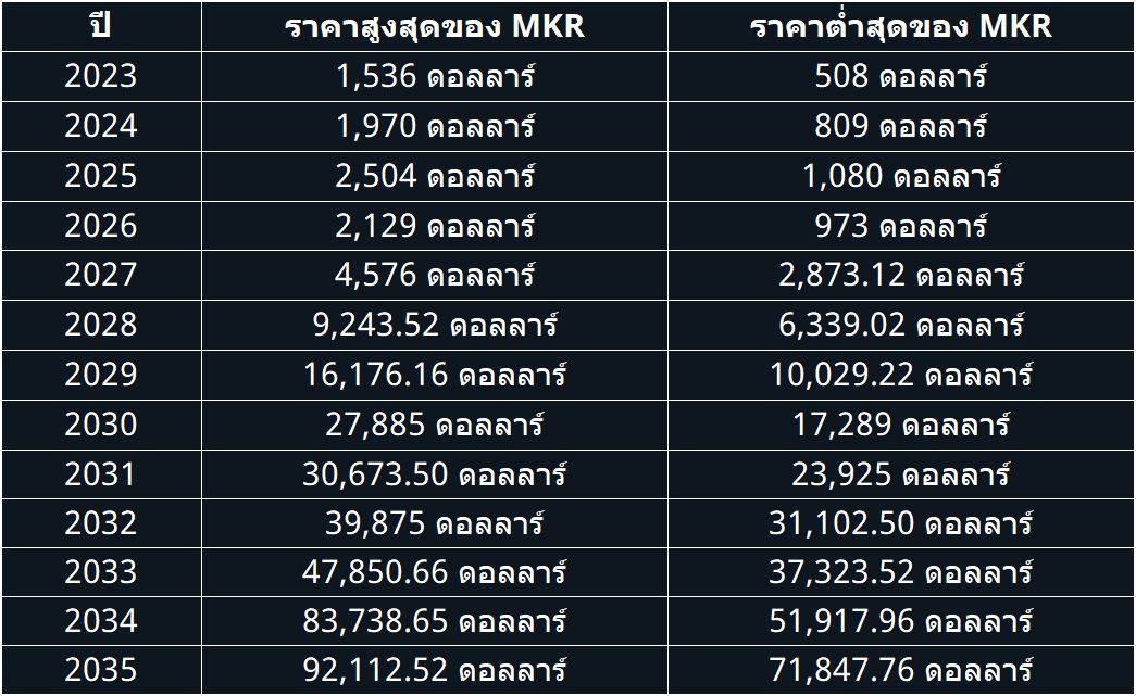 จนถึงปี 2030 ดูเหมือนว่า MKR นั้นจะเป็นตัวเลือกการลงทุนที่ดี เราคาดว่ามันจะทำจุดสูงสุดตลอดกาลใหม่ได้หลังปี 2028 และถ้าหากคุณวางแผนที่จะถือโทเค็นนี้ไว้ในระยะยาว นี่เป็นตารางข้อมูลที่อาจจะช่วยให้คุณใช้อ้างอิงได้ไปจนถึงปี 2035