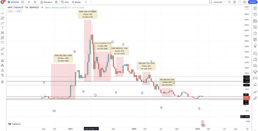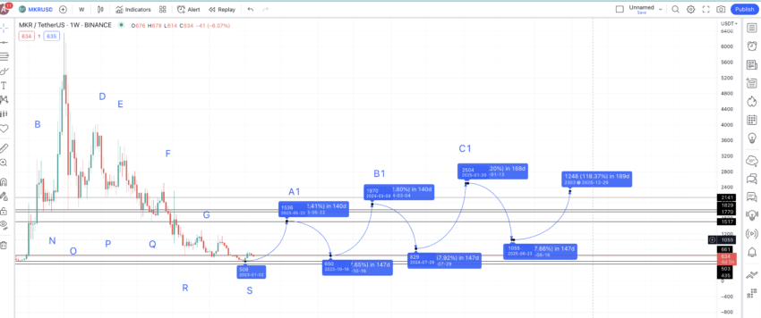 เราจะกำหนดให้จุดสูงสุดในปี 2023 เป็นจุด A1 ซึ่งอาจจะปรากฏขึ้นมาสูงกว่าจุด G และอาจจะเป็นจุดเริ่มต้นของเทรนด์ขาขึ้นของราคา MKR ดังนั้น จากจุดต่ำสุดในปี 2023 หรือ 650 ดอลลาร์ เราสามารถคาดหวังจุดสูงสุดที่มีการเติบโตเพิ่มขึ้น 202.06% ซึ่งเท่ากับ 1,970 ดอลลาร์ และน่าจะเกิดขึ้นในช่วงเดือนมีนาคม 2024