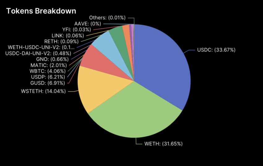 ต่อไป เราจะมาดูข้อมูล TVL ของ Maker กัน ส่วนใหญ่นั้นจะเป็น WETH (Wrapped ETH) และ USDC ดังนั้น หากตลาดโดยรวมย่ำแย่หรือ Stablecoin ยอดนิยมได้รับผลกระทบใดๆ มันก็อาจจะส่งผลกระทบต่อ TVL ของ Maker ได้เช่นกัน