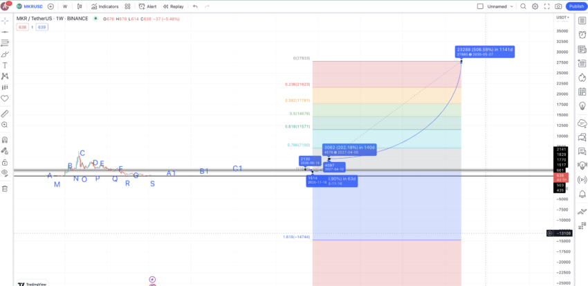 ตอนนี้ เรามีจุดสูงสุดในปี 2027 และจุดต่ำสุดในปี 2026 แล้ว เราสามารถใช้ Fib Level เพื่อคำนวนเส้นทางการเติบโตไปจนถึงปี 2030 ได้ การประมาณการดังกล่าวได้ผลลัพท์ออกมาว่าราคาของ MKR จะอยู่ที่ 27,885 ดอลลาร์ ภายในช่วงปลายปี 2030 ซึ่งถึงแม้ว่าการคาดการณ์ราคาในลักษณะนี้อาจจะดูใจถึงไปซักหน่อย แต่ทั้งนี้มันก็ขึ้นอยู่กับการเติบโตของ DAI Stablecoin ซึ่งขับเคลื่อนโดย Maker Protocol ด้วย