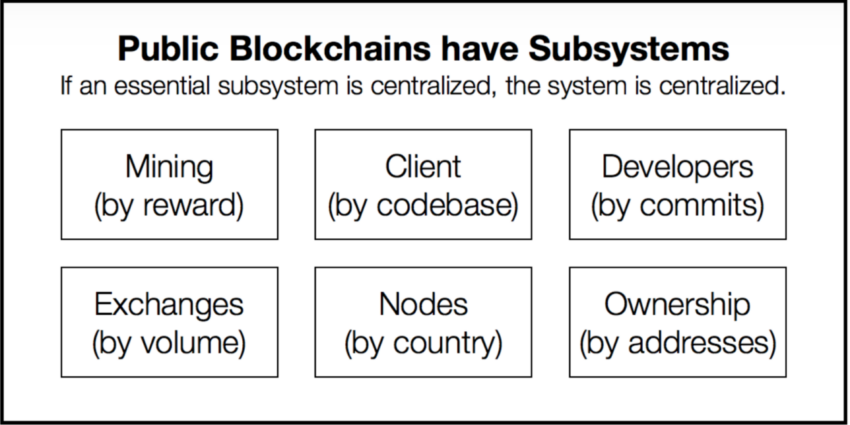 นั่นเพราะมีหลายปัจจัยที่ส่งผลต่อคะแนน ในการทำงานกับการมาตรวัด คุณต้องพิจารณาให้ถี่ถ้วนว่าระบบย่อย blockchain ใดที่กำลังประเมินอยู่ โปรดทราบว่ามีหลายวิธีที่บล็อกเชนสามารถกระจายอำนาจได้ แม้ว่าบล็อคเชนจะทำคะแนนได้ดีสำหรับการกระจายอำนาจบางประเภท แต่ระบบที่สำคัญอีกระบบหนึ่งก็อาจมีการรวมศูนย์ที่สูง