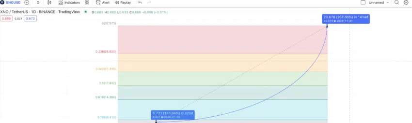 ตอนนี้ เรามีจุดสูงสุดในปี 2026 และราคาต่ำสุดของ XNO ในปี 2025 เราสามารถเชื่อมโยงจุดดังกล่าวโดยใช้ระดับ Fib ซึ่งจะช่วยให้เราสามารถคำนวนจุดสูงสุดได้จนถึงปี 2030 ดังนั้น หาก Nano ข้ามผ่านราคา 4 ดอลลาร์ไปได้ภายในปี 2025 ระดับ Fib Extension จะทำให้การคาดการณ์ราคา Nano สำหรับปี 2030 อยู่ที่ระดับสูงสุดที่ 32.51 ดอลลาร์