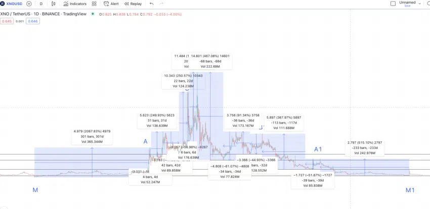 มันซื้อขายแบบ Sideway อยู่ที่จุดเริ่มต้นและจุดสิ้นสุดของรูปแบบ นอกจากนี้จุดสูงและต่ำที่อยู่ระหว่างนั้นยังดูสมมาตรอีกด้วย เราสามารถสันนิษฐานได้ว่า XNO เป็นไปตามรูปแบบการพับกลับ โดยที่ส่วนที่ 1 ประกอบไปด้วยจุดสูงที่สูงขึ้น และส่วนที่ 2 ประกอบไปด้วยจุดสูงที่ต่ำลง