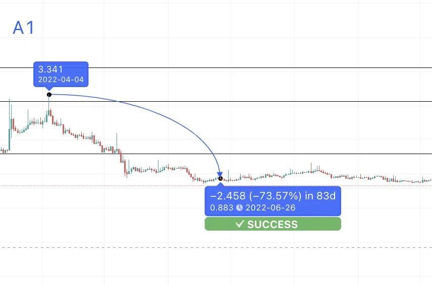 ตอนนี้ ให้เก็บตัวเลขสถิติเอาไว้เพื่อใช้คำนวน การเปลี่ยนแปลงของราคาจากจุดสูงไปต่ำโดยเฉลี่ยอยู่ที่ 73.28% ดังนั้น จุดต่ำสุดใหม่จาก A1, M1 ควรจะเป็น 73.28 ดอลลาร์เป็นอย่างน้อย ช่วงระยะเวลาอาจจะแตกต่างกันไประหว่าง 20 ถึง 300 วันจากข้อมูลที่ได้มา (ขึ้นอยู่กับสถานะและความเชื่อมั่นของตลาด Crypto)