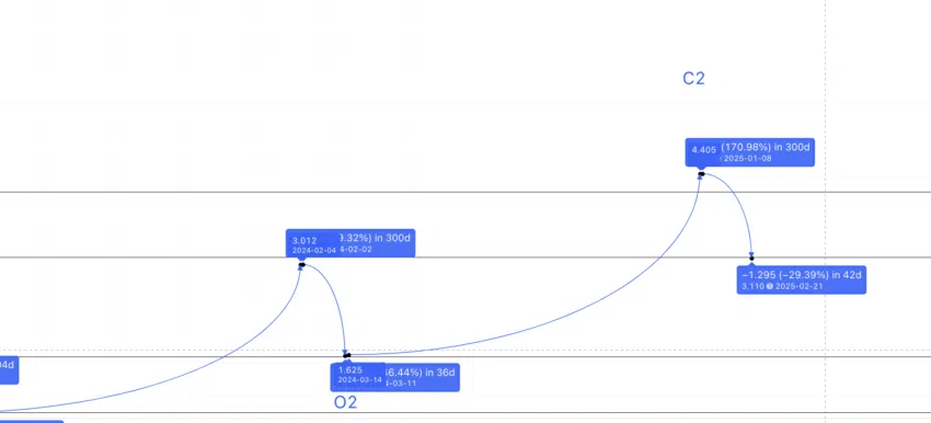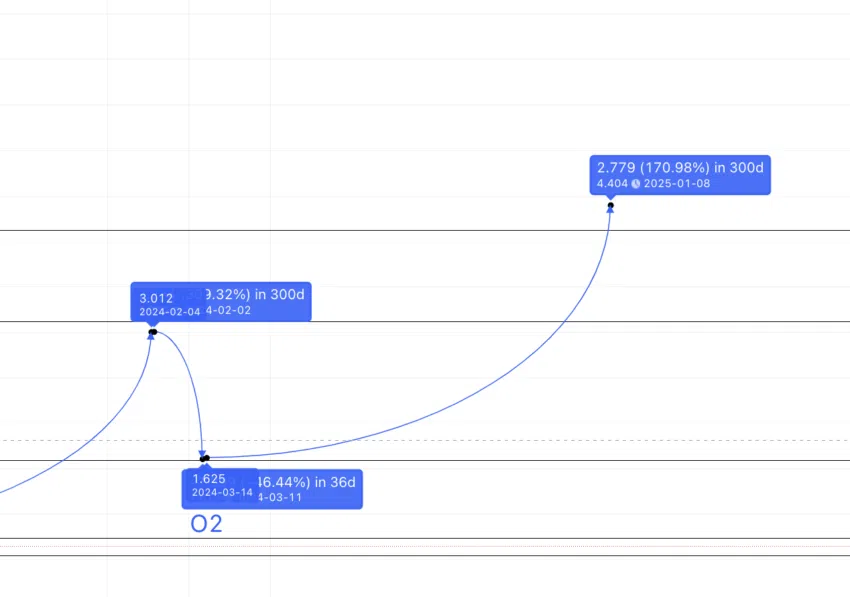 จุดต่ำสุดในปี 2024 อาจจะอยู่ที่ 1.613 ดอลลาร์ จุดสูงสุดถัดไป — O2 ถึง C2 — อาจจะเกิดขึ้นที่ใดก็ได้ระหว่าง 91.34% ถึง 250.57% โดยใช้ตัวเลขจากชุดข้อมูลที่ 3 และ 4 เมื่อพิจารณาถึงผลกระทบของตลาดหมี ค่าสูงสุดที่เป็นจริงมากกว่านั้นจะอยู่ในช่วง 300 วัน (สูงสุดจากตารางด้านบน ) และเพิ่มขึ้นสูงถึง 170.95% (ค่าเฉลี่ยจาก 91.34% และ 250.57%)