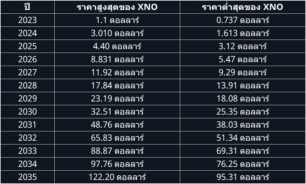 - ปัจจุบัน XNO มีมูลค่าลดลง 98.29% จากราคาสูงสุดตลอดกาล