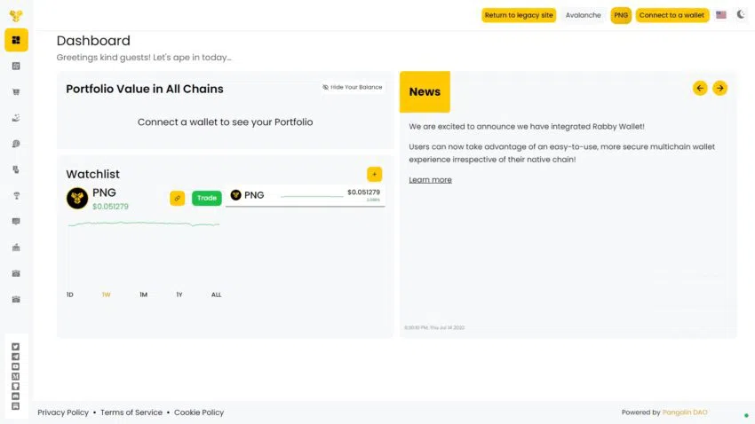 การ Staking บน Pangolin นั้นตรงไปตรงมาและให้ผลตอบแทนประมาณ 24% คุณจะต้องมีกระเป๋าเงินที่รองรับ Avalanche หรือ Ethereum ด้วย