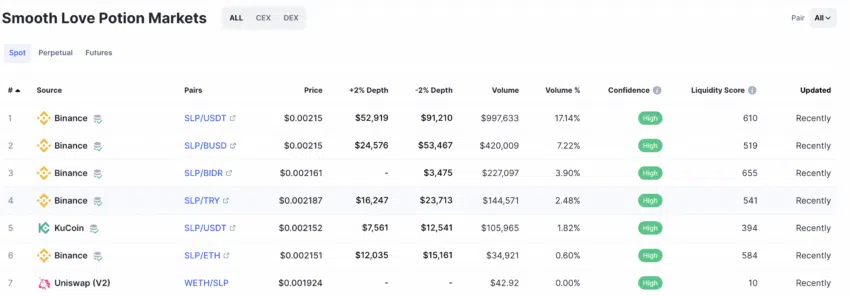 นอกจากนี้ แม้ว่ามันจะเป็นโทเค็นสารพัดประโยชน์ แต่ SLP ก็มีค่าสเปรดในตลาดที่ค่อนข้างดี คู่ซื้อขาย SLP-USDT ของ Binance นั้นโดดเด่นที่สุดในแง่ของปริมาณการซื้อขาย ค่าสเปรดซื้อขายที่ยอดเยี่ยมนั้นจะสร้างความเชื่อมั่นต่อ SLP ในฐานะสินทรัพย์ Crypto ที่ซื้อขายได้และใช้ในการลงทุน