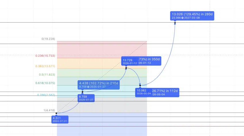 จากระดับต่ำสุดที่คาดการณ์ไว้ที่ 0.847 ดอลลาร์ การเติบโต 210 วันและ 1,111.63% จะทำให้ราคาอยู่ที่ 10.255 ดอลลาร์ ซึ่งมันจะเกิดขึ้นได้ก็ต่อเมื่อสภาวะของตลาดคริปโตเป็นไปอย่างปกติ