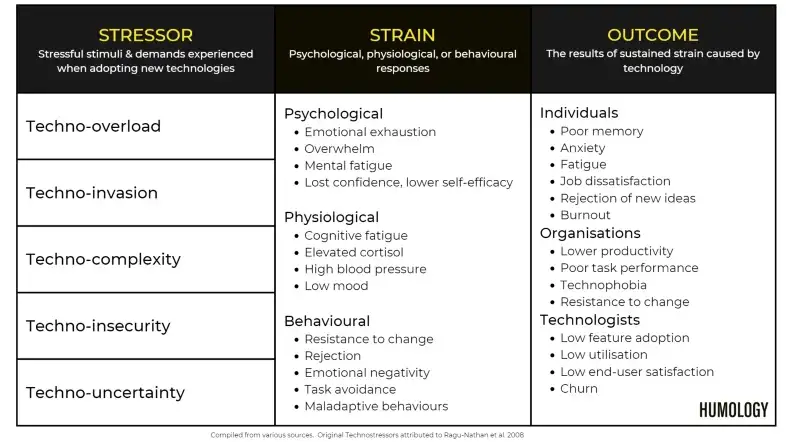 การวิจัยเกี่ยวกับนักเทคโนโลยีกำลังเพิ่มขึ้นในช่วงไม่กี่ปีที่ผ่านมา ในขณะที่เราพยายามทำความเข้าใจสาเหตุเบื้องหลังของการนำไปใช้ในระดับต่ำ การเปลี่ยนแปลงทางดิจิทัลที่ล้มเหลว และประสิทธิภาพการทำงานที่ลดลงในที่ทำงาน ในขณะที่การค้นพบใหม่ยังคงปรากฏอยู่ เทคโนสเตรสมักได้รับการวิเคราะห์ในห้าโดเมนหลัก แต่ละโดเมนทำหน้าที่เป็น ‘ตัวสร้างความเครียด’ แต่ละตัวที่มีส่วนทำให้เกิดความเครียดทางเทคโนโลยีโดยรวม แรงกดดันเหล่านี้ทำหน้าที่เป็นภัยคุกคามที่ซ่อนอยู่ต่อการนำดิจิทัลไปใช้ และมีศักยภาพที่จะขัดขวางแม้กระทั่งการปรับใช้เทคโนโลยีที่ได้รับการพิจารณาอย่างรอบคอบที่สุด