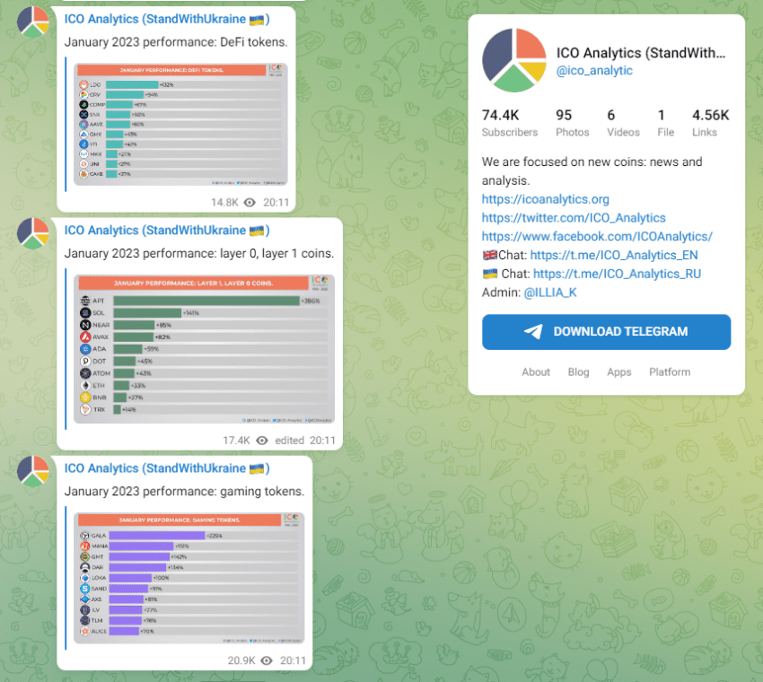 ICO Analytics คือช่อง Telegram ที่เข้าร่วมได้ฟรี สมาชิกจะได้รับข้อมูลข่าวสารเกี่ยวกับโทเค็นต่างๆ ที่เกิดขึ้นใหม่ในตลาดคริปโต ช่องนี้ยังให้ข้อมูลล่าสุดเกี่ยวกับการเปิดรอบ ICO ของสกุลเงินดิจิทัลต่างๆ, การขึ้นทะเบียนเหรียญใหม่ และรอบพรีเซลล์ เป็นต้น